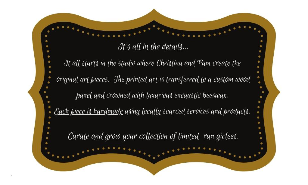 We are a small team that loves what we do, making each original piece of art by hand, from concept to final encaustic coat. We are busy in our studio every day, creating pieces that bring us joy that we can then pass on to you.